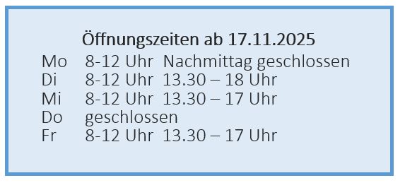 Aufgrund der veränderten Personalsituation werden unsere Öffnungszeiten ab 17.11.2025 wie folgt angepasst